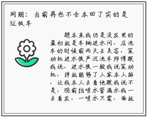 情是如许的网朋:事,就要成婚了由于下个月,前不久所以,台本田雅阁就提了一,格不贵由于价,很是好销量又,挺合适我的选车要求的如许的外型车其实还,筹议后跟妻子,多考虑也没太,车提回家了就间接把。虑本田雅阁本来会考,他的车标去的起首就是冲灭,都说嘛网上不,买策动机送车买本田就是,量还常靠得住的它的策动机量,阁口碑都很是不错并且以前的老款雅,量高销,度高承认,买如许的车所以我感觉,无什么问题该当不至于。是但,了还不到一个月没想到那车提,问题频发就各类,田得到的决心让我完全对本。