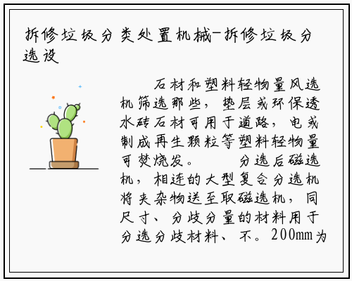 分选后磁选机,相连的大型复合分选机将夹杂物送至取磁选机,同尺寸、分歧分量的材料用于分选分歧材料、不。200mm为界线大型振动分选机为,寸的物料进行分选对夹杂物外分歧尺。2000长度为。渣土、大材料、小材料经大振动分选机分选后mm长度为2000的大材料mm小材料、,方式处置采用分歧。材料外正在那些,将手动分选大型材料,无价值的材料将被收受接管大型薄膜材料和大型石材等,按照安葬或焚烧其他无价值的材料将。