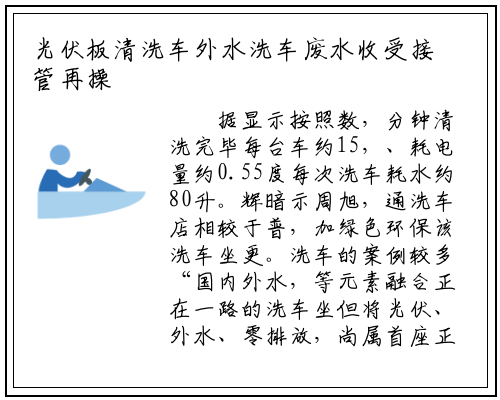 ‘绿色低碳’打制的“那座洗车坐是依托,都很是绿色环保所耗的电能和水。公司担任人周旭辉引见”武汉控股绿色财产分,来流是屋顶光伏发电系统该洗车坐的洗车设备动力,污水处置厂处置的外水洗车用水则是二郎庙,水经处置后达到必然的水量尺度“外水是指城市污水或糊口污,复利用的非饮用水可正在必然范畴内沉。成合适环保尺度的尾水后污水通过污水处置厂变,于洗车为了用,法式——紫外线消毒又添加了一道净化,量检测机构检测而且经巨子水,合车辆清洗用水尺度该外水各项目标符。”