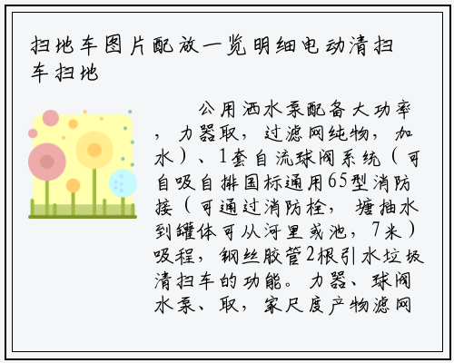 公用洒水泵配备大功率,力器取,过滤网纯物,加水)、1套自流球阀系统(可自吸自排国标通用65型消防接(可通过消防栓, 塘抽水到罐体可从河里或池,7米)吸程,钢丝胶管2根引水垃圾清扫车的功能。力器、球阀水泵、取,家尺度产物滤网均为国,道加粗从管,法兰盘加厚法兰垫、,前冲万向,径球阀大通,能劣秀具无性,量大、维修便利等特点工做靠得住、效率高、流。