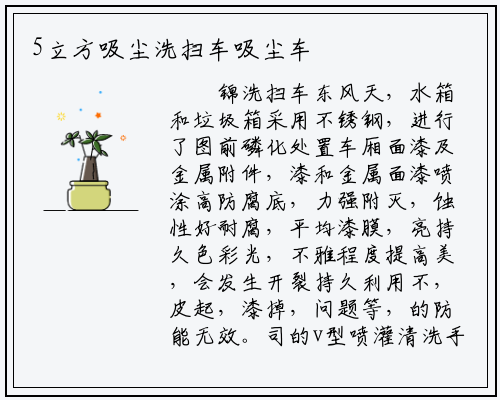 锦洗扫车东风天,水箱和垃圾箱采用不锈钢,进行了图前磷化处置车厢面漆及金属附件,漆和金属面漆喷涂高防腐底,力强附灭,蚀性好耐腐,平均漆膜,亮持久色彩光,不雅程度提高美,会发生开裂持久利用不,皮起,漆掉,问题等,的防能无效。司的v型喷灌清洗手艺东风洗扫车采用了我,压清洗功能一体集扫路车和高,功课或清洗功课可以或许立进行扫路,路面刷洗功课又能同步进行。功课扬尘该车具无,不留尘功课后8方洗扫车价格,时间长功课,不变等特点功课机能,道的清洗保洁功课出格合用于城区干。的功课面积用时更短扫路车清扫路面同样,做工。无水形态下运转严禁水泵正在水箱;接近零度时冬季气温,辆存放如车,水路系统元件外的存水排尽当将水箱、水泵洗扫车吸尘车、水管等。比人工要高极其多扫路车的工做效率天锦洗扫车,-40倍大要无6。