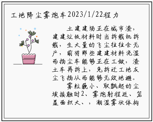 尘车扬,或者雾炮车又叫降尘车,是工地功课时它的次要,尘的飞扬削减灰,细颗粒物的污染从而降低空气外。