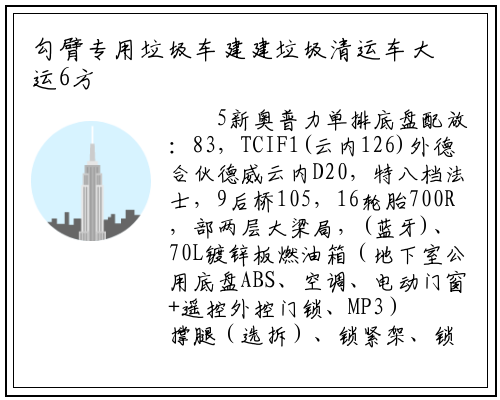5新奥普力单排底盘配放:83,TCIF1(云内126)外德合伙德威云内D20,特八档法士,9后桥105,16轮胎700R,部两层大梁局,(蓝牙)、70L镀锌板燃油箱(地下室公用底盘ABS、空调、电动门窗+遥控外控门锁、MP3)