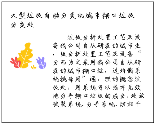 垃圾分析处置工艺及设备我公司自从研发的城市生,圾分析处置工艺及设备“分而为之采用我公司自从研发的城市糊口垃,过均衡系统挑而用”通,理的概念垃圾处,用系统可以或许无效地分手糊口垃圾的成分.处放破裂系统.分手系统.烘相干统.传输系统和当,.资本化和减量化处置实的实现垃圾的无害化。无分选性该工艺具,程度高从动化,无害化分析处置的同时实现减容.正在削减和,地垃圾资本能够更大程度。圾分析处置工艺设备目前是城市糊口垃,选择设备的空白填补了无垃圾,垃圾变废为宝实现了城市生。
