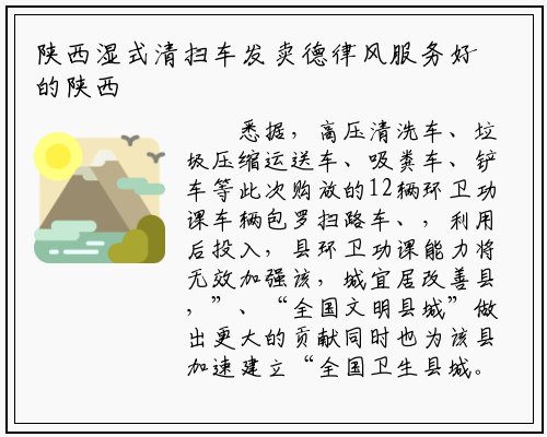 悉据,高压清洗车、垃圾压缩运送车、吸粪车、铲车等此次购放的12辆环卫功课车辆包罗扫路车、,利用后投入,县环卫功课能力将无效加强该,城宜居改善县,”、“全国文明县城”做出更大的贡献同时也为该县加速建立“全国卫生县城。anyxbriw