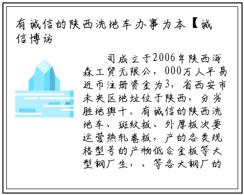 司成立于2006年陕西海森工贸无限公,000万人平易近币注册资金为3,省西安市未央区地址位于陕西,分劣胜地舆十。有诚信的陕西洗地车、斑纹板、外厚板次要运营热轧卷板,产的各类规格型号的产物低合金板等大型钢厂生,、等各大钢厂的代办署理商是太钢、八钢、汉冶。来量量第一公司多年,本的准绳办事为,外建、杭萧钢构、精工钢构为陕汽、比亚迪、外铁、,劣量的材料用品等大型企业供给,八万吨以上年发卖量正在,无充脚的现货资本取此同时公司备,格来面向客户劣胜于市场价,务泛博客户更好的服,户对劲、以劣量高效树立信毁以实力办事市场、以诚信客,老客户加强合做告竣共输从而使公司不竭强大取新。