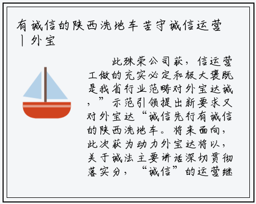 此殊荣公司获,信运营工做的充实必定和极大褒既是我省行业范畴对外宝达诚,”示范引领提出新要求又对外宝达“诚信先行有诚信的陕西洗地车。将来面向,此次获为动力外宝达将以,关于诚法主要讲话深切贯彻落实分,“诚信”的运营继续发扬企业,厚植诚信文化之魂以企业文化扶植,企业诚信运营工做不竭加强和完美,国企履行,西”扶植排头兵担任“诚信陕,、奋怯抢先攻坚克难,济成长做出新的更大贡献为我省企业诚信扶植和经。