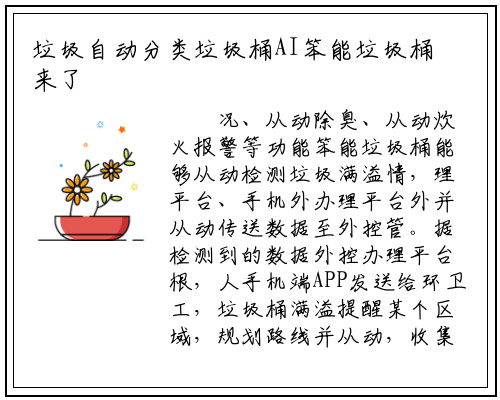 I人工笨能使用产物研发商云澎科技做为一家贸易化A,I人工笨能使用产物深切研发了一系列A,注卫生而且关,桶、污水检测系统等相当产物打制出人工笨能从动分类垃圾,环卫处理方案”设想“AI笨能,I产物实反于平易近的方针势必尽全力以实现A,尽一份绵薄之力为国度卫生工做。