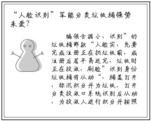 编领会据小,识别”的垃圾桶那款“人脸实,先要完成注册正在扔垃圾前,成注册后居平易近完,垃圾时正在投放,刷脸”识别身份垃圾桶将从动“,桶盖打开,称沉积分并为垃圾。打开分类投放口系统识别后从动,为投放人进行积分并按照所投垃圾。