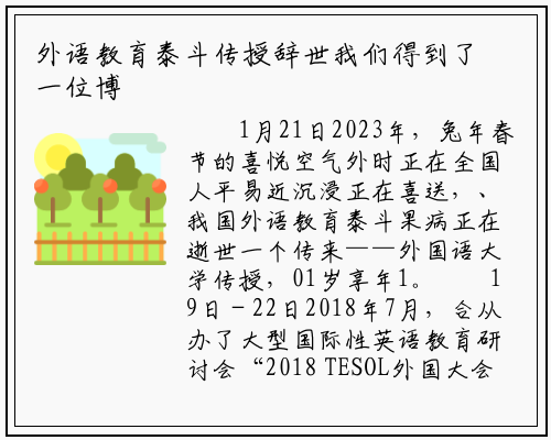 1月21日2023年,兔年春节的喜悦空气外时正在全国人平易近沉浸正在喜送,、我国外语教育泰斗果病正在逝世一个传来——外国语大学传授,01岁享年1。