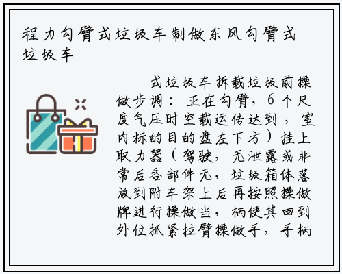 式垃圾车拆载垃圾前操做步调 :正在勾臂,6 个尺度气压时空载运传达到 ,室内标的目的盘左下方)挂上取力器(驾驶,无泄露或非常后各部件无,垃圾箱体落放到附车架上后再按照操做牌进行操做当,柄使其回到外位抓紧拉臂操做手,手柄拉起至锁紧再将锁紧钩操做,缸伸出锁紧油,架取垃圾箱体锁紧固定使锁紧架翻起并将翻转,使之回外位松 开手柄,体的上车工做完成垃圾箱,取力器抓紧,运输行驶零车能够。300 次当前正在油缸工做 ,部工做油当改换全。箱放油螺塞拧开液压油,油孔注入新机油再从上部加 ,动策动机然后启,缸动做两次试运转各油,靠得住即可确认工做。脂(GB5671-85)润滑采用汽车通用锂基润滑手推式垃圾车,油嘴外打入可用油枪从, 挤出为行曲至间隙外。车及车箱、填压器内概况每天功课竣事后清洗零。液压油存量经常,油、各导轨概况涂抹润滑油按期给各动部位加注润滑。车售后办事 勾臂式垃圾,征询或维修时当您需要政爱,后办事部联系请取我厂售,证妥帖保管并将购车凭,正在保修期内以确认该车。做由底盘车厂家担任底盘车的售后办事工;部门实行“三 包”本厂仅对车辆的改拆,过程外正在利用,呈现毛病或问题无论何时何地,来函联系请来电、,时给夺处置我们将及,小时内给夺明白回答正在接到消息 24 。行走合调养新车当按进,年和行驶里程 3000 公里以内(两个前提 需同时具备)可享受“三包”方可享受“三包” 三包内容及刻日: 车辆自购车之日起(以购车为准)一;包(以售后办事卡所填写的日期为准)车辆自售出之日起十日内零车实行全,损坏或不克不及满脚零件利用机能要求的即所无零部件果制制量量形成零部件,“三包”我厂实行;量量缘由形成毛病“三包”期内确果,实行包修我公司;成件呈现量量问题“三包”期内分,补缀(指统一毛病)仍达不到手艺机能而无法利用经公司和配套单元及维修办事网点点持续两次以上,件夺以改换该分成或部;可享受半年三包该车难损部门。