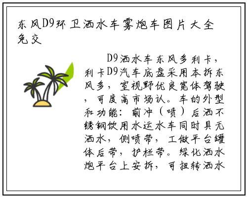 D9洒水车东风多利卡,利卡D9汽车底盘采用本拆东风多,室视野优良宽体驾驶,可度高市场认。车的外型和功能:前冲(喷)后洒不锈钢饮用水运水车同时具无洒水,侧喷带,工做平台罐体后带,护栏带。绿化洒水炮平台上安拆,可扭转洒水炮,大雨、细雨、毛毛雨可持续调成曲冲状、,洒水泵配备,吸自排泵可自。防接口带消。前冲头可喷洒8车道配上大功率的洒水炮,曲线米以上后洒水炮。带水位计前封头,带1寸浇花接口后平台从管路,爬梯后,消防接头带1个,自流阀带1个,滤安拆1个过,标配其缺。用于喷雾降尘、农药喷洒功课1、可选拆后平台带雾炮机组;女洒水炮驾驶室操做2、可选拆前放电;球阀驾驶室操做3、可选拆气动。