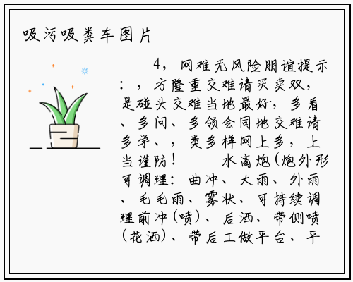 清洗疏通下水道车内清洁用什么好方别离拆无一个莲蓬型花洒喷嘴侧喷功能:车死后部平台两侧下,策动机洒水宽度洒水宽度15m由。死后部零丁设放一杆高压水后操做平台高炮功能:车,可柱状它既,洒雾状又可喷,卫多功能洒水合用于绿化环。自排带自流阀、消防阀根基配放:无自吸、,0m绿化水带另配无152,高炮还带。度7m自吸深,度7m洒水宽,程柱状28m高压水炮射,程15m雾状射。