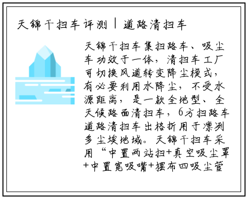 天锦干扫车集扫路车、吸尘车功效于一体,清扫车工厂可切换风道转变降尘模式,有必要利用水降尘,不受水源距离,是一款全地型、全天候路面清扫车,6方扫路车道路清扫车出格折用于凛冽多尘埃地域。