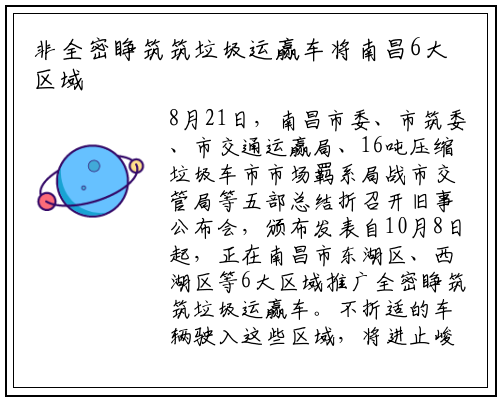 按照南昌市五部总结折下发的通知,规定的筑筑垃圾运赢办理重点区域根基涵盖东湖区、西湖区、青云谱区、青山湖区、高新区及红谷滩新区。据悉,自10月8日起,正在重点区域范畴内运赢筑筑垃圾(含沙石、粉煤灰、种植土战其他散装物料)应使器具备全密睁运赢机器安装,并安装止驶记真、卫星定位等电子安装。折适前提的车辆能够打点通止证,全天运赢,但逐日7:00-9:30战17:00-18:30上放工岑岭期除中。