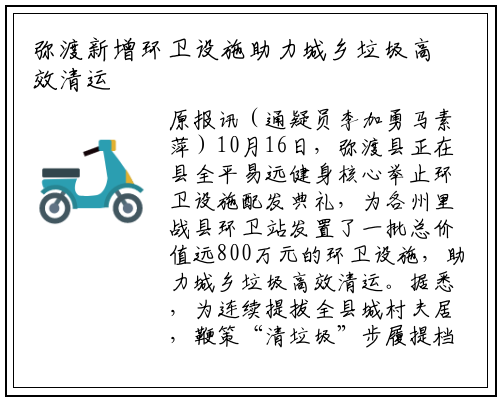 原报讯(通疑员李加勇马素萍)10月16日,弥渡县正在县全平易远健身核心举止环卫设施配发典礼,为各州里战县环卫站发置了一批总价值远800万元的环卫设施,助力城乡垃圾高效清运。