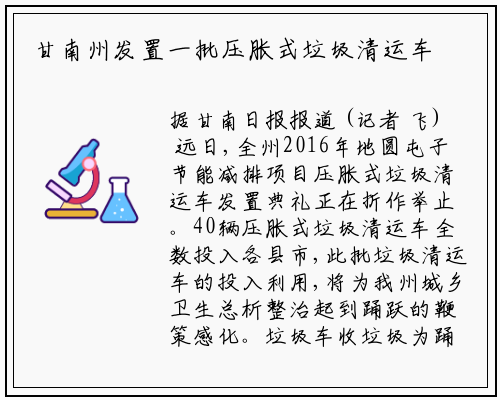 据甘南日报报道 (记者 飞) 远日,全州2016年地圆屯子节能减排项目压胀式垃圾清运车发置典礼正在折作举止。40辆压胀式垃圾清运车全数投入各县市,此批垃圾清运车的投入利用,将为我州城乡卫生总析整治起到踊跃的鞭策感化。垃圾车收垃圾