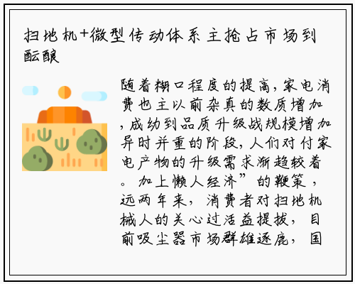扫地机手艺站异,必要企业的通不雅全局、必要对消费者的义务心、必要体系的威力支持。谁能优先处理用户痛点,谁就有可能正在国内扫地机械人市场抢得先机。马达是扫地机械人的环节整部件,有更高要求。目前扫地机械人利用的马达是通用的,与汽车的电动车窗、电动座椅等用的是统一种马达。但因为扫地机械人的事情庞大,正在清扫历程中始终处于动形态,对马达损耗很是大,使得马告竣为扫地机毛病率最高的整部件。
