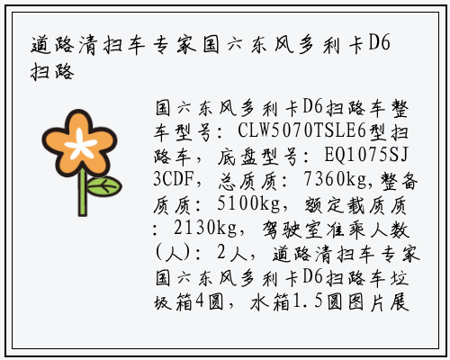 国六东风多利卡D6扫路车整车型号:CLW5070TSLE6型扫路车,底盘型号:EQ1075SJ3CDF,总质质:7360kg,整备质质:5100kg,额定载质质:2130kg,驾驶室准乘人数(人):2人,道路清扫车专家国六东风多利卡D6扫路车垃圾箱4圆,水箱1.5圆图片展隐: