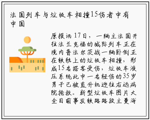 原报讯 17日,一辆主法国开往法兰克福的城际列车正在境内普法尔茨战一辆卧倒正在铁轨上的垃圾车相撞,形成15名搭客受伤,垃圾车液压系统此中一名轻伤的35岁男子已被直升机迎往右远病院抢救。新型垃圾车图片大全目前事发铁路路段主曼海姆到萨尔布吕肯之间的火车路线已被。