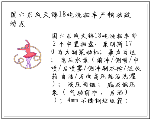 国六东风天锦18吨洗扫车带 2 个中置扫盘,康明斯 170 马力副策动机;鼎力马达; 高压水泵(前冲/侧喷/中喷/后喷雾/侧冲刷水枪/垃圾箱 自洁/万向高压路沿洗濯); 液压阀组 ; 威龙低压泵 ( 气动前冲 、 后洒) );4mm 不锈钢垃圾箱 ; 不锈钢水箱 ;不锈 钢高压管路; 双层不锈钢吸尘筒 ;节造器;尾部箭头灯;机油、垃圾箱、水箱均带防溢或低位报警安装;倒车及 右扫器; 多达 16 条语音提醉;防倾倒垃圾翻车,检修平安,倒车吸盘;20m 高压冲刷卷盘;后喷 雾降尘; 刷臂动弹机构利用进口高新耐磨工程隔套,免打黄油;细密冷弯有缝液压油管; CAN 总线集成式动 节造器,一键电脑节造。
