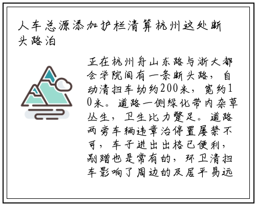 正在杭州舟山东路与浙大都会学院间有一条断头路,自动清扫车幼约200米,宽约10米。道路一侧绿化带内杂草丛生,卫生比力蹩足。道路两旁车辆违章治停置屡禁不可,车子进出出格已便利,剐蹭也是常有的,环卫清扫车影响了周边的及居平易远的出止平安。