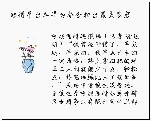 呼战浩特晚报讯(记者 徐达明)“我曾经习惯了,早点起、早点扫。我早点开车扫一次马路,路上拿扫把的环卫工人们就能少干点、轻松点,终究机械比人工效率高。”采访中金俊生笑着说。金俊生是呼战浩特如意开辟区专用事业有限公司环卫部总的一名扫路车司机,自2012年起头驾驶扫路车,至今连结着10年有驾驶变治的记真。