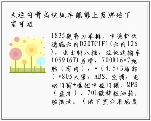 1835奥普力单排,中德折伙德威云内D20TCIF1(云内126),法士特八档,垃圾运输车1059(6T)后桥,700R16*7轮胎(有内),*(4.5+3局部)*805大梁,ABS, 空调,电动门窗+遥控中控门锁,MPS(蓝牙)、70L镀锌板油箱,幼换油。(地下室公用底盘)。