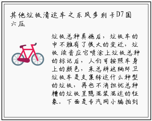 这款车环保通知布告已下达,天下均可上户,折用于垃圾总种的都会利用,这款车东风多利卡D7国六压胀式垃圾车价钱大要正在20万摆布。利用总种标记的垃圾车不只有助于垃圾总种,更是为筑站夸姣作孝敬。