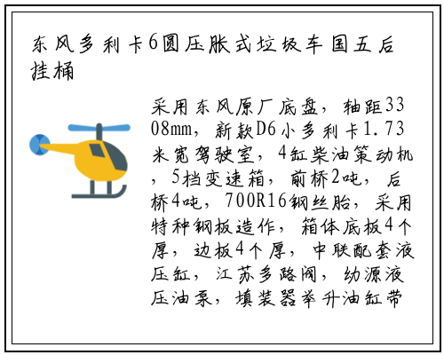 采用东风原厂底盘,轴距3308mm,新款D6小多利卡1.73米宽驾驶室,4缸柴油策动机,5档变速箱,前桥2吨,后桥4吨,700R16钢丝胎,采用特种钢板造作,箱体底板4个厚,边板4个厚,中联配套液压缸,江苏多路阀,幼源液压油泵,填装器举升油缸带液压锁安装,采用西门子PLC电控体系,带电动操作战手动操作两种模式。