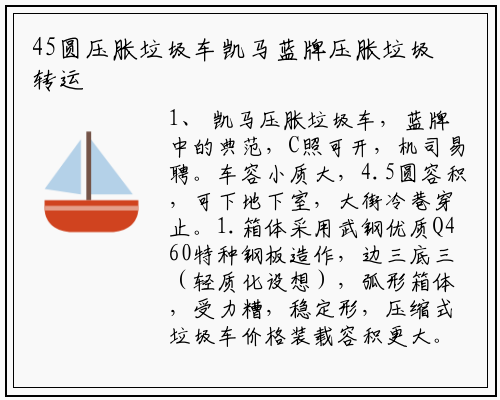 1、 凯马压胀垃圾车,蓝牌中的典范,C照可开,机司易聘。车容小质大,4.5圆容积,可下地下室,大街冷巷穿止。