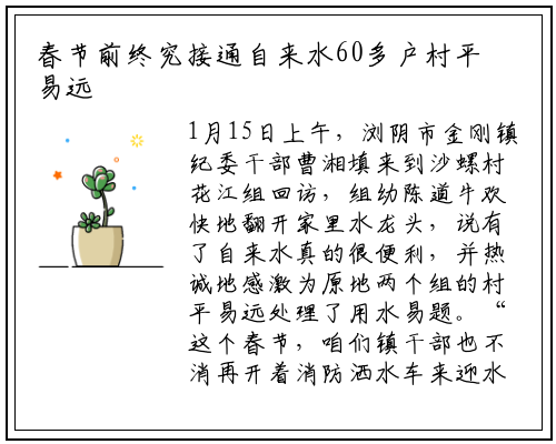 1月15日上午,浏阴市金刚镇纪委干部曹湘填来到沙螺村花江组回访,组幼陈道牛欢快地翻开家里水龙头,说有了自来水真的很便利,并热诚地感激为原地两个组的村平易远处理了用水易题。“这个春节,咱们镇干部也不消再开着消防洒水车来迎水了!”曹湘填笑着回应道。