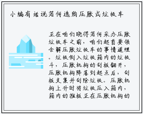 正在咱们晓得若何采办压胀垃圾车之前,咱们起首要领会解压胀垃圾车的事情道理。垃圾倒入垃圾箱内的垃圾斗,压胀机构的刮板翻开,压胀机构降落到起点后,刮板支集并刮除垃圾。压胀机构上升时将垃圾压入箱内,箱内的推板正在压胀机构的配折感化下将垃圾压紧。压胀机构将垃圾频频挤压到必然水平,将垃圾推入带有腹板的箱体内,进一步压真垃圾。