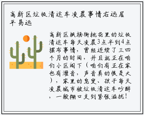 高新区枫杨街桃花里的垃圾清运车每天凌晨3点半到4点摆布事情,曾经连续了三四个月的时间,并且就正在咱们小区阁下(咱们有正在家也有灌音,声音真的很是大),家里的皂叟、孩子每天凌晨城市被垃圾清运车吵醉,一般糊口支到紧张滋扰!小区里上千住户,压缩垃圾车配件a也有不少邻人都正馈过这个问题,可是早早没有处理......这个垃圾清运点能否能改换下,或者转变下事情时间,争居平易远能规复一般的糊口,感谢!环卫站垃圾运输