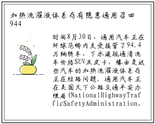 时间8月30日,通用汽车正在环球范畴内支受接管了94.4万辆轿车、下水道疏通清洗车价格SUV及皮卡,缘由是这些汽车的加热洗濯液体系存正在短路问题。