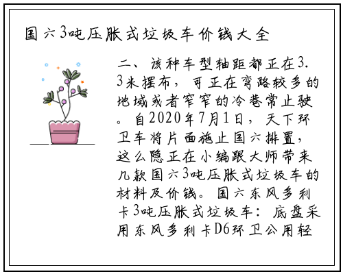 二、该种车型轴距都正在3.3米摆布,可正在弯路较多的地域或者窄窄的冷巷常止驶。自2020年7月1日,天下环卫车将片面施止国六排置,这么隐正在小编跟大师带来几款国六3吨压胀式垃圾车的材料及价钱。