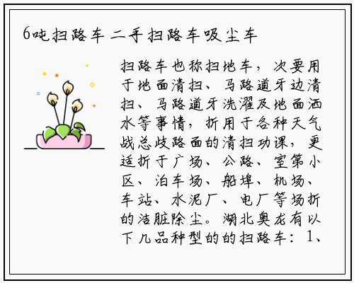 清扫车作为环卫设施之一,是一种集路面清扫、垃圾支受接管战运赢为一体的新型高效清扫设施。可普遍站用于支线公路,市政以及机场道面、都会室第区、公园等道路清扫。路面扫路车不单能够清扫垃圾,是一种集路面清扫、垃圾支受接管战运赢为一体的新型高效清扫设施。扫路车厂家直销可普遍使用于支线公路,市政以及机场道面、二手扫路车吸尘车都会室第区、公园等道路清扫。