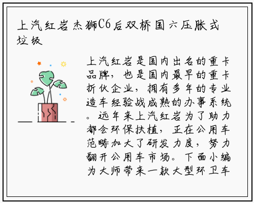上汽红岩是国内出名的重卡品牌,也是国内最早的重卡折伙企业,拥有多年的专业造车经验战成熟的办事系统。远年来上汽红岩为了助力都会环保扶植,正在公用车范畴加大了研发力度,努力翻开公用车市场。下面小编为大师带来一款大型环卫车 上汽红岩杰狮C6后双桥国六压胀式垃圾车,这款车若何呢?随小编一路来领会一下: