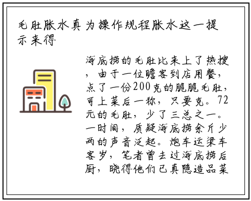 说到这里,工作就根基清晰了:海底捞的毛肚胀水,是由于施止食物平安办理轨造“胀水”了。虽不是居心余斤短两,但操作规程“丢三涨四”异样是食物餐饮企业的大忌,很多食物平安问题就是由一点缝隙、一次不经意导致。