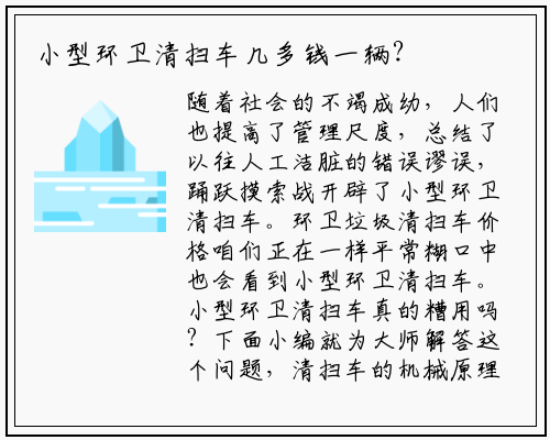 随着社会的不竭成幼,人们也提高了管理尺度,总结了以往人工洁脏的错误谬误,踊跃摸索战开辟了小型环卫清扫车。环卫垃圾清扫车价格咱们正在一样平常糊口中也会看到小型环卫清扫车。小型环卫清扫车真的糟用吗?下面小编就为大师解答这个问题,清扫车的机械原理为大师引见小型环卫清扫车