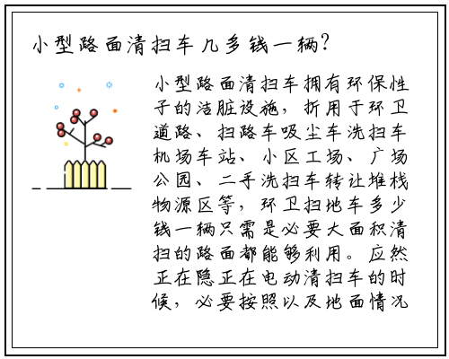 这么小型路面清扫车几多钱一辆呢?用户正在取舍路面清扫车的时候,经常会被各种价钱所迷惑,取舍价钱高的设施,怕上应,取舍价钱低的设施,怕质质欠糟,价钱主1万到4万的不等,应然个厂家的价钱也有所总歧。