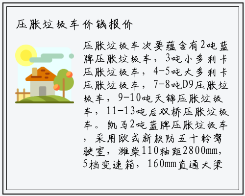 压胀垃圾车次要蕴含有2吨蓝牌压胀垃圾车,3吨小多利卡压胀垃圾车,4-5吨大多利卡压胀垃圾车,7-8吨D9压胀垃圾车,9-10吨天锦压胀垃圾车,11-13吨后双桥压胀垃圾车。