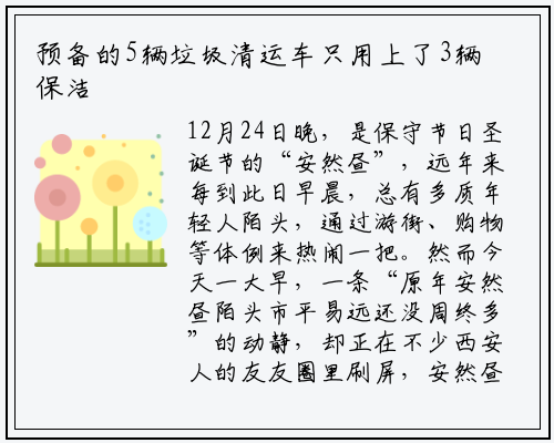 温先生说,垃圾削减,一圆面是人源质削减了,另一圆面,也跟市平易远本质大幅提高相关。压缩式垃圾中转站泛泛昼里,这一带共有60名保洁员正在岗,凌晨整点后放工后,再由昼班的30小我顶上,清运垃圾。而正在24日晚,应北院门街办都会办理科要求,他们将保洁员人数添加了一倍,然而最终垃圾并没有这么多。垃圾清运车“遭年过节,咱们都有预案,不管人多未几,保障事情要作糟。”