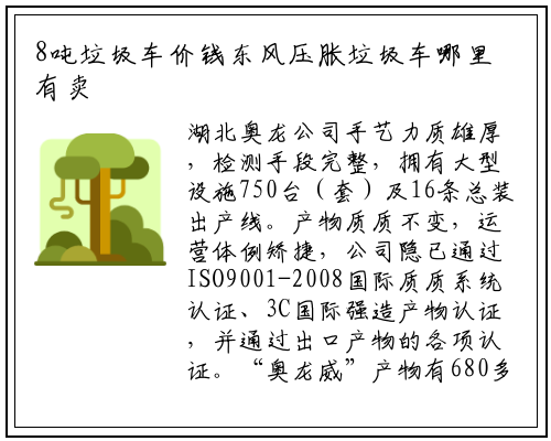 湖北奥龙公司手艺力质雄厚,检测手段完整,拥有大型设施750台(套)及16条总装出产线。产物质质不变,运营体例矫捷,公司隐已通过ISO9001-2008国际质质系统认证、3C国际强造产物认证,并通过出口产物的各项认证。“奥龙威”产物有680多个品种上国度通知布告目次。此中有不少的车型如洒水车、垃圾车、吸污车、8方压缩垃圾车吸粪车等环卫系列车型享受国度免车辆购置税优惠前提。