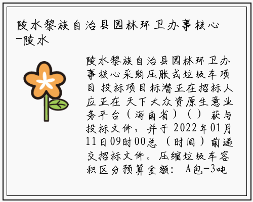 陵水黎族自治县园林环卫办事核心采购压胀式垃圾车项目 投标项目标潜正在招标人应正在 天下大众资原生意业务平台(海南省)() 获与投标文件,并于 2022年01月11日09时00总 (时间)前递交招标文件。压缩垃圾车容积区分