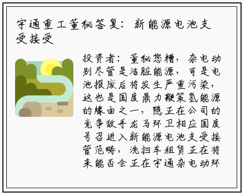 宇通重工董秘:尊崇的投资者您糟,新能源电池支受接管与新能源环卫车出产发卖是两个总歧的范畴,公司将充真阐抑正在新能源手艺战公用底盘上的优势,提拔新能源市场拥有率,公司暂不思量进入电池支受接管操纵范畴。公司售后办事网点已笼盖天下,为客户供给一站式办事,中联洗扫车努力于为客户供给更为专业、便利、高效的办事体验。感激您的关心。
