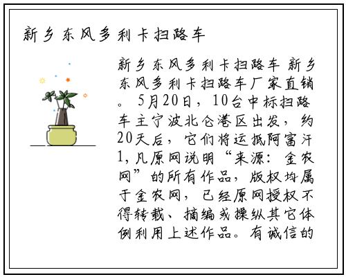 新乡东风多利卡扫路车 新乡东风多利卡扫路车厂家直销。 5月20日,10台中标扫路车主宁波北仑港区出发,约20天后,它们将运抵阿富汗