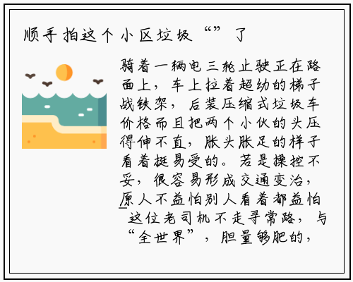 这位老司机不走寻常路,与“全世界”,胆量够肥的,如许硬闯,小命堪忧,垃圾中转站离住户距离何况你还带着个孩子,为了孩子战您的生命平安,咱不急正在这一秒钟,车祸猛于虎,且止且憎惜!