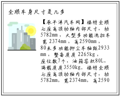 【承平洋汽车网】福特全顺七座高顶幼轴内部尺寸,幼5782mm ,大型多功能洗扫车 宽 2374mm ,高2590mm ,80米多功能抑尘车轴距2933mm ,整备质质 2265kg , 座位数7个,油箱容积80L,满载质质3550kg。