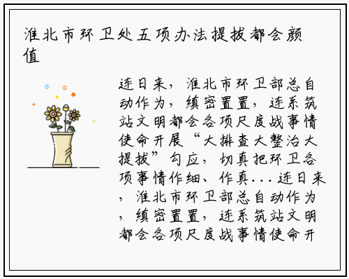 连日来,淮北市环卫部总自动作为,缜密置置,连系筑站文明都会各项尺度战事情使命开展“大排查大整治大提拔”勾应,切真把环卫各项事情作细、作真...